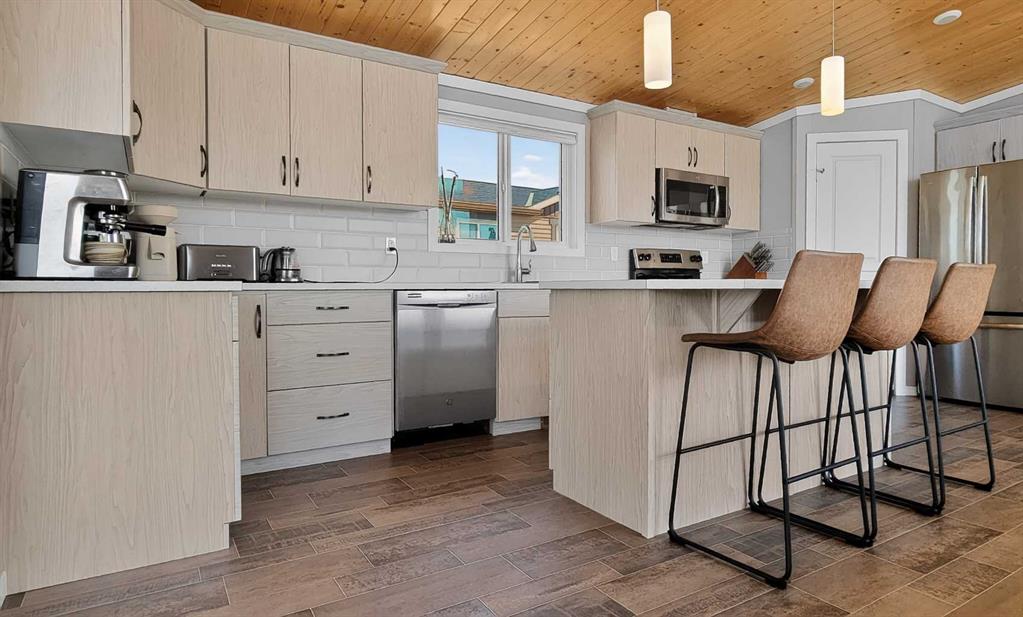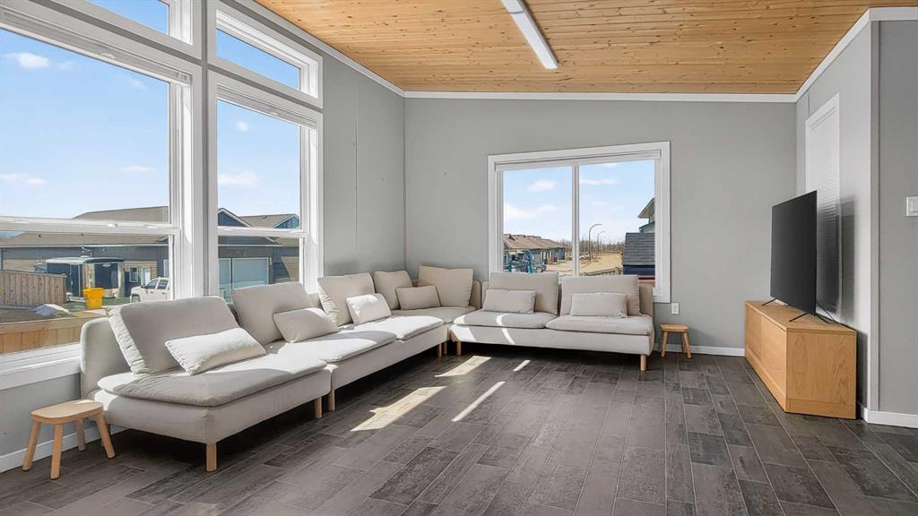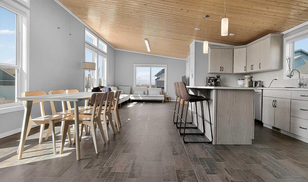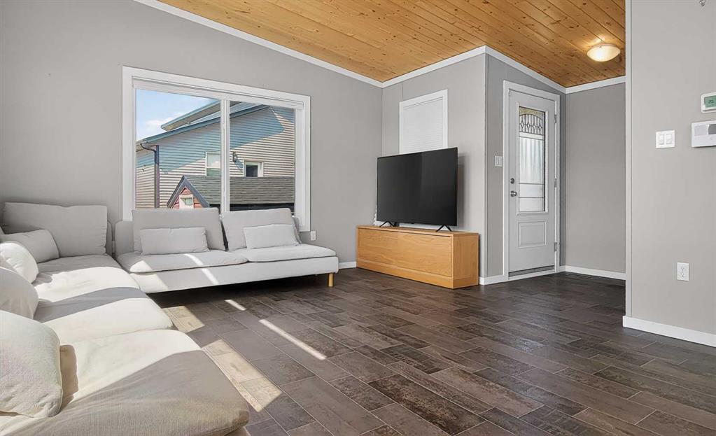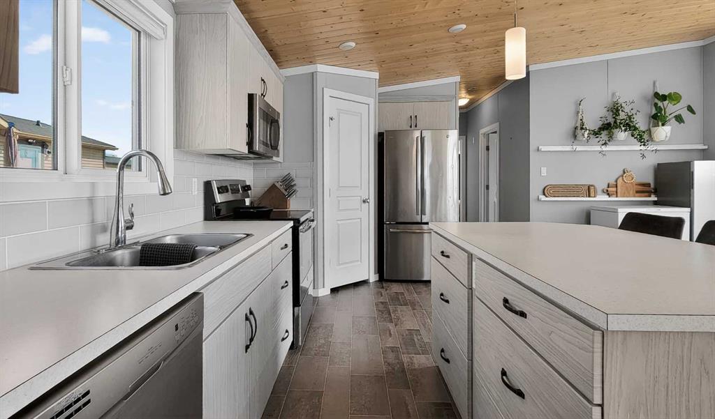 Experience style & comfort at this former show home in Kensignton, Grande Prairie. Your new home offers a well-designed 2-bedroom, 2-bathroom layout with a cohesive modern aesthetic throughout. A striking natural wood tongue-and-groove ceiling spans the entire unit, adding warmth and architectural character to every room. Cooled with Central AC, the open-concept kitchen and living area form the heart of the home. The kitchen is equipped with upgraded light grey shaker-style cabinetry, white subway tile bac...